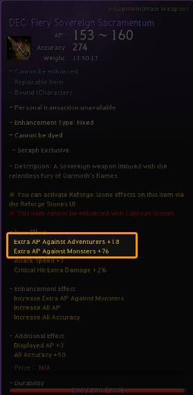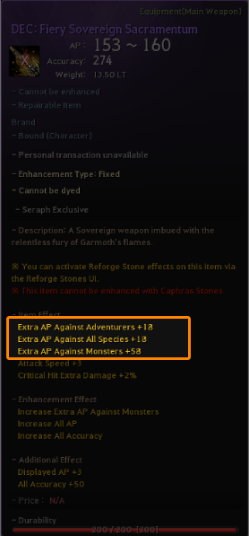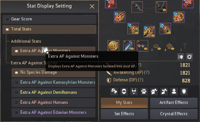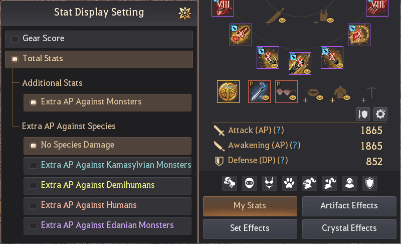 When viewing your current character stats as Total Stats, you can see the combined values of Extra AP against specific species, such as Humans, Kamasylvian Monsters, Demihumans, and Edanian Monsters. The "Extra AP Against All Species" effect found on equipment such as Sovereign Main Weapons and Awakening Weapons is also included in these totals.